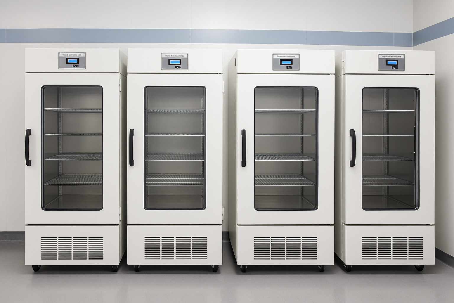Laboratory freezers sized for raw materials, intermediates, and reference lots.